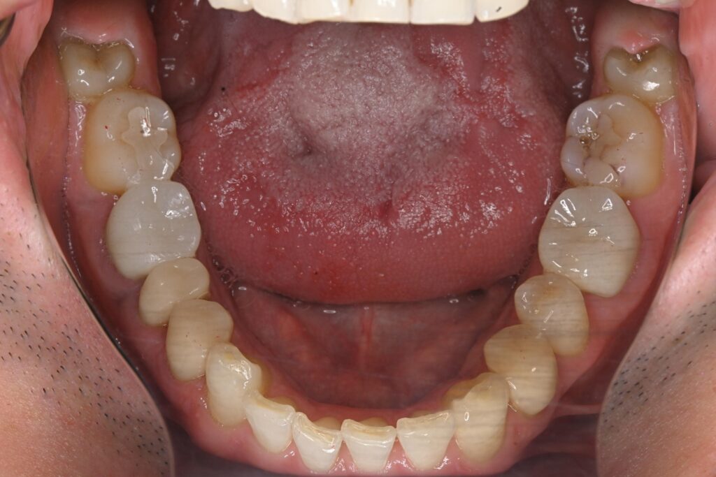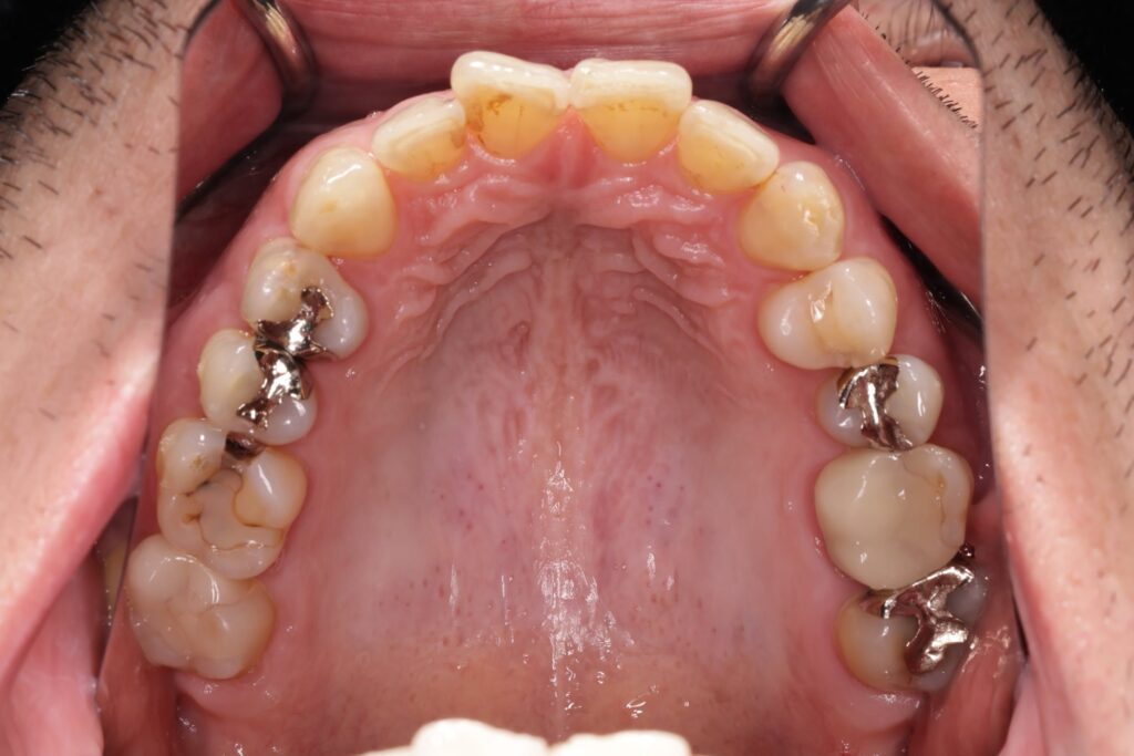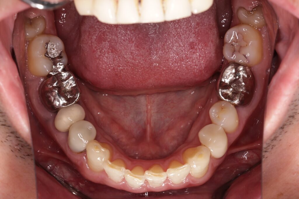 口腔内には多数の銀歯(銀合金)が確認されました。患者様は過去に多くの虫歯治療を受けており、そのほとんどが保険適用内の銀合金で修復されていました。