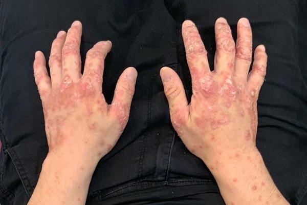 ご自身でホームページなどで調べた結果、手足にできている発疹(出身)が、金属アレルギーが原因で発生しているのではないかと気づかれました。すでに皮膚科でパッチテストを受けており、特にニッケルなどに対するアレルギーがあることを検査結果から把握されていました。